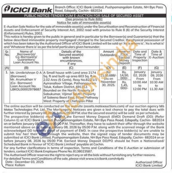 A Small house with Land area 2174 Sq. ft and built-up areo 603 Sq. ft in 2.02 Ares (5 Cents), Resy No.822/1/1 Ayiranalloor Village. Pathanapuram Taluk, Kollam District, 691312. Bounded on the North: Property of Sabukumar, Vijimol South: Property of Saleena Beevi East: B Feet Pathway. West: Property of Chellapan Pillai