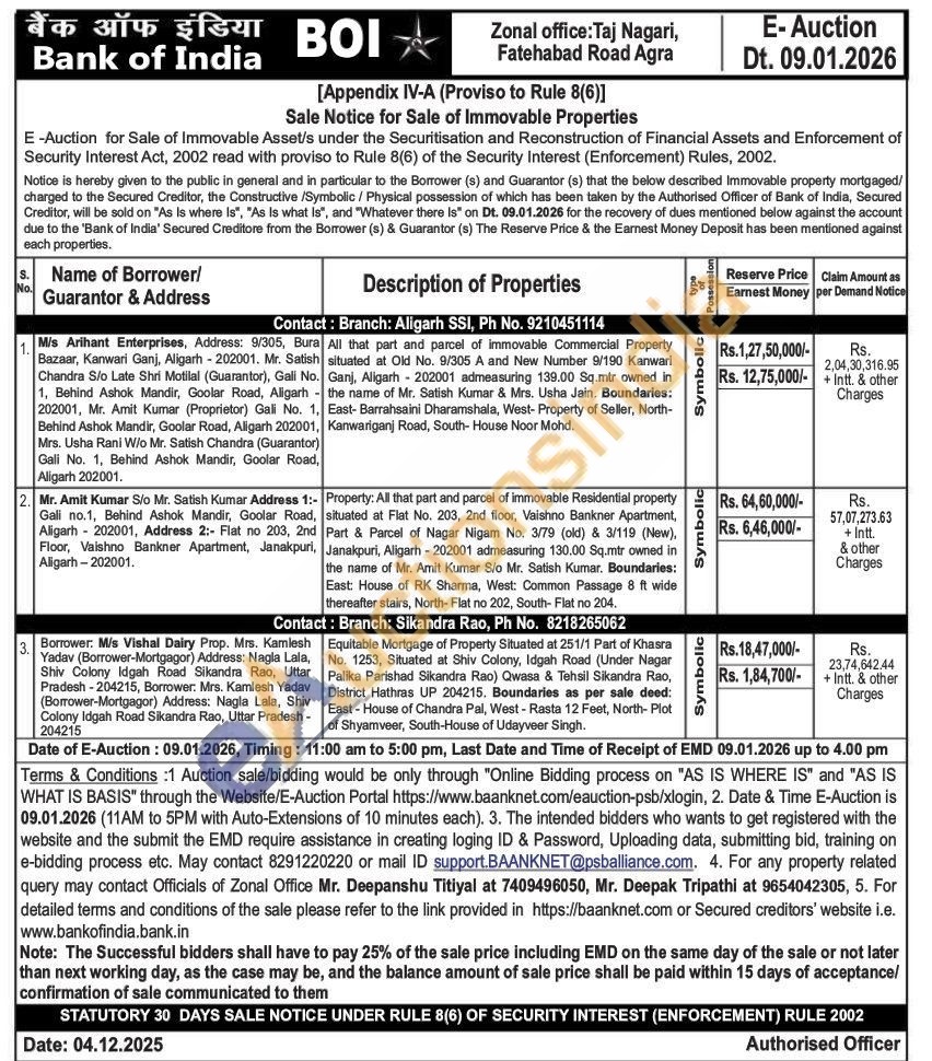 All that part and parcel of immovable Commercial Property situated at Old No. 9/305 A and New Number 9/190 Kanwari Ganj, Aligarh 202001 admeasuring 139.00 Sq.mtr owned in the name of Mr. Satish Kumar & Mrs. Usha Jain. Boundaries: East-Barrahsaini Dharamshala, West- Property of Seller, North-Kanwariganj Road, South- House Noor Mohd