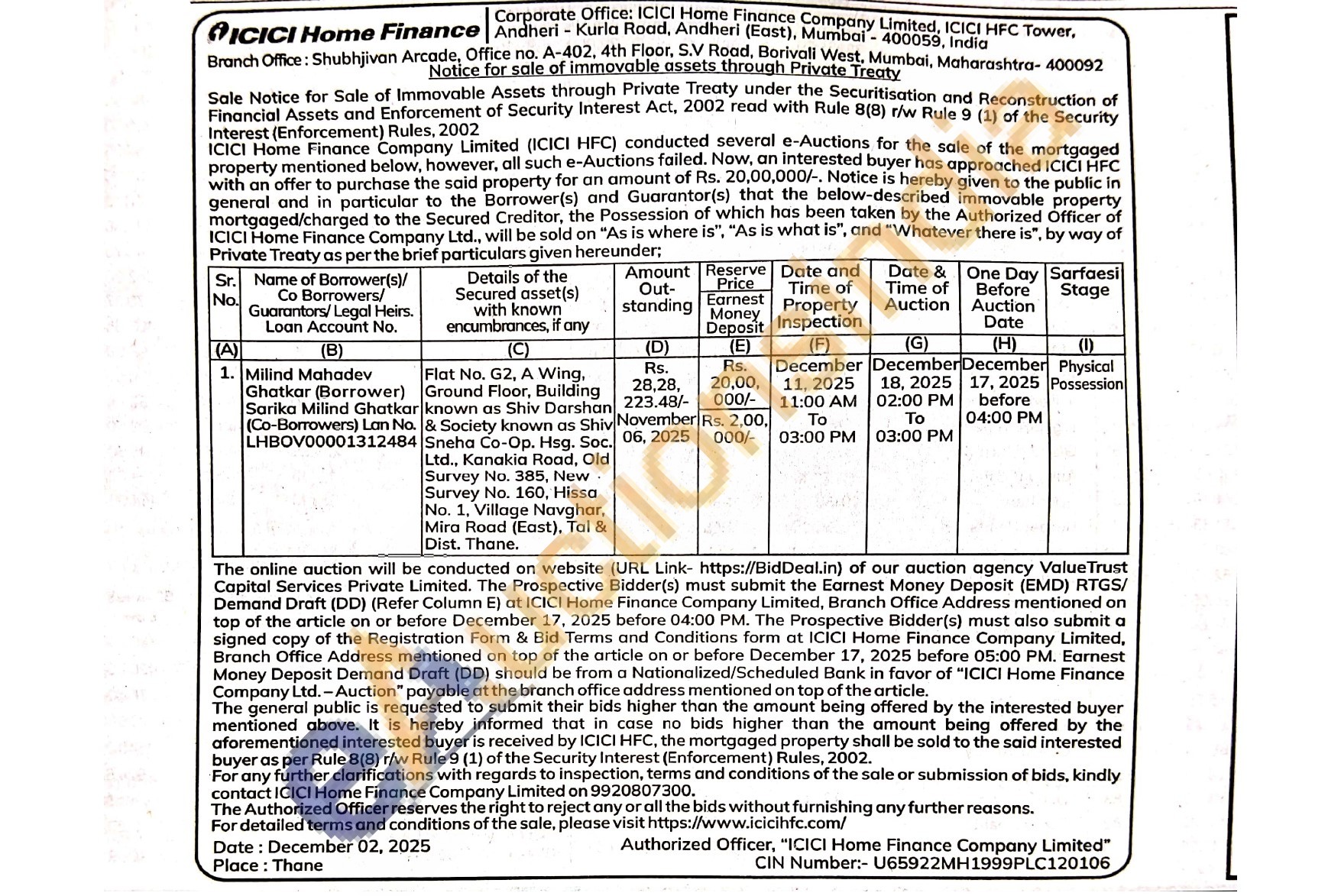 Flat No. G2, A Wing, Ground Floor, Building known as Shiv Darshan & Society known as Shiv Sneha Co-Op. Hsg. Soc. Ltd., Kanakia Road, Old Survey No. 385, New Survey No. 160, Hissa No. 1, Village Navghar, Mira Road (East), Tal & Dist. Thane.