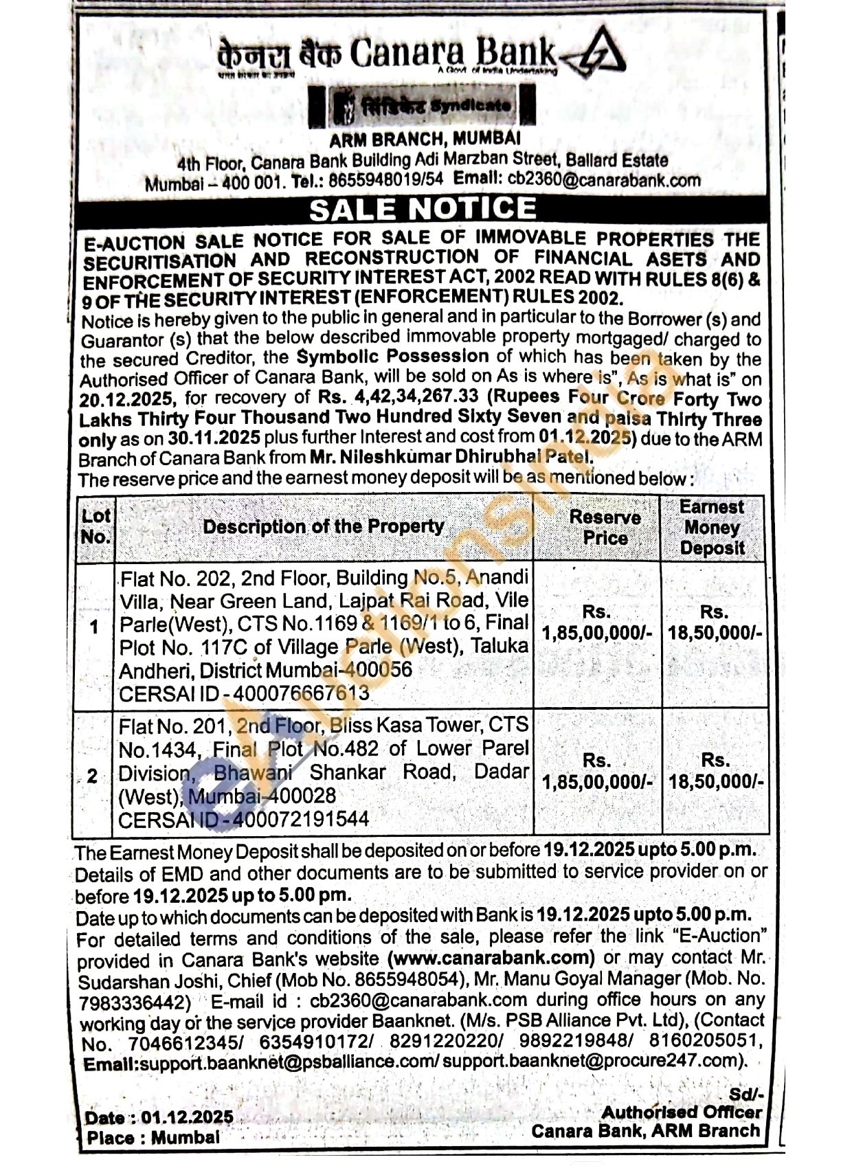 Flat No. 202, 2nd Floor, Building No.5, Anandi Villa, Near Green Land, Lajpat Rai Road, Vile Parle (West), CTS No. 1169 & 1169/1 to 6, Final Plot No. 117C of Village Parle (West), Taluka Andheri, District Mumbai-400056 CERSAI ID-400076667613