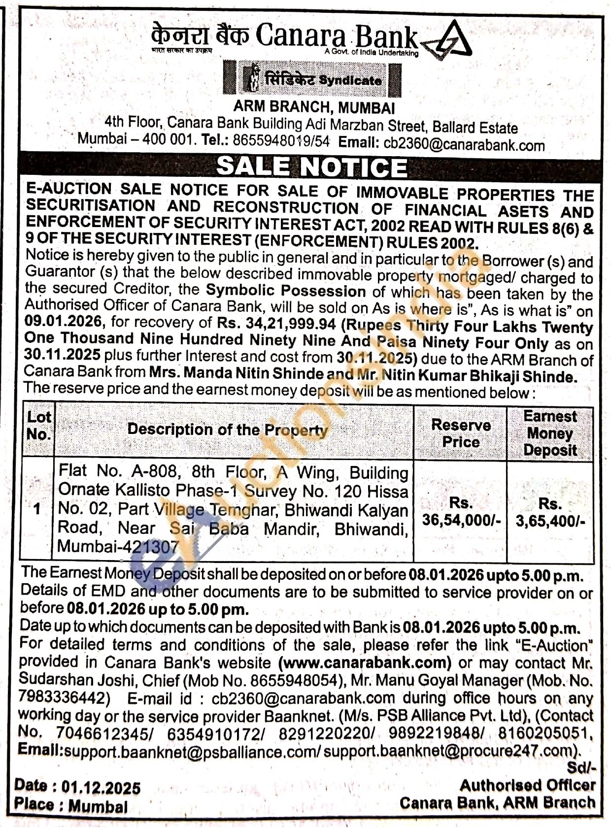 Flat No. A-808, 8th Floor, A Wing, Building Ornate Kallisto Phase-1 Survey No. 120 Hissa No. 02, Part Village Temghar, Bhiwandi Kalyan Road, Near Sai Baba Mandir, Bhiwandi, Mumbai-421307