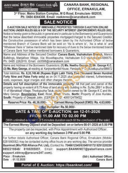 Details and full description of the immovable property: All that part and parcel of the property having an extent of 6.70 Ares of land along with building in Re. Sy. No. 288/1 in Block 11 of Manakkad Village, Thodupuzha Taluk, Idukki District owned by Mr. George KC and Ms. Mary George. Boundaries: East: Road, West: Thodu, North: Property of Jose Kuriako, South: Property of Deepak John. (CERSAI SI ID: 400012478452)