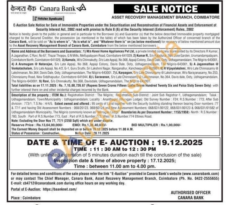Description of the property: ITEM No.1: Registration District: The Nilgiris; Registration Sub-District: Joint Sub Registrar-1, Udhagamandalam; Taluk: Udhagamandalam: Town/Municipality: Udhagamandalam; Locality: Ananthagiri (Murugan Lodge); Old Survey Number: F24; R.S.Number: 773; After Sub division: 773/1, T.S.No: H/4/5. Extent owned and offered: 95 cents of Land together with the Security building standing thereon bearing Door numbers :77 & 77/1 and having Old Assessment Numbers 068/20123, 068/60124 and New Assessment Numbers: 068/031/00122, 068/031/00123 & 068/031/01582 of Udhagamandalam Municipality, The Nilgiris commonly known as "Murugan Lodge Boundaries As per Document Number: 1155/1959:-North: R.S.Number 780, South Part of R.S.Number: 773, East: Part of R.S.Number: 773, West: R.S.Number: 774 Ettines Road.