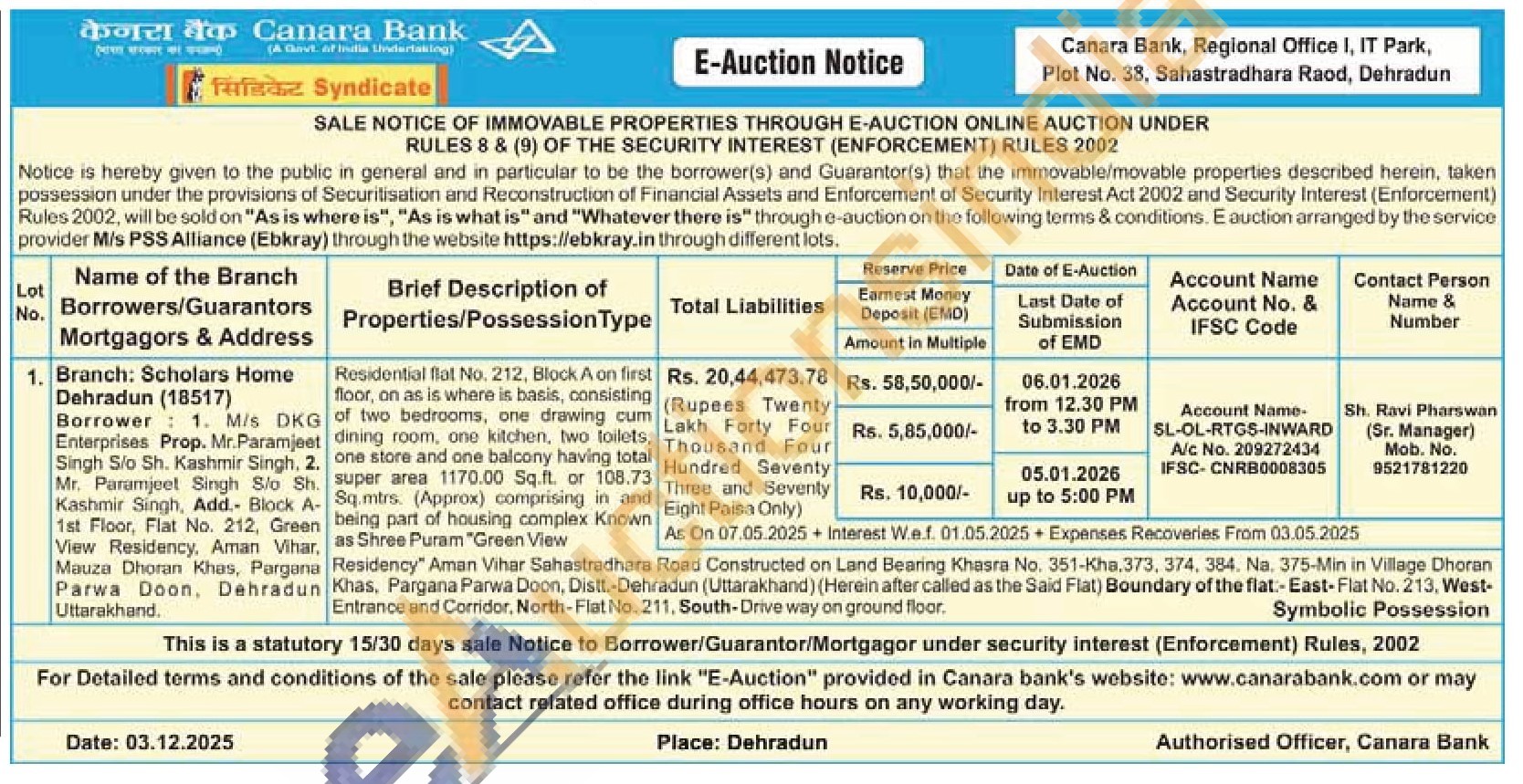 Residential flat No. 212, Block A on first floor, on as is where is basis, consisting of two bedrooms, one drawing cum cum dining room, one kitchen, two toilets, one store and one balcony having total super area 1170.00 Sq.ft. or 108.73 Sq.mtrs. (Approx) comprising in and being part of housing complex Known as Shree Puram "Green View Residency" Aman Vihar Sahastradhara Road Constructed on Land Bearing Khasra No. 351-Kha,373, 374, 384. Na. 375-Min in Village Dhoran Khas, Pargana Parwa Doon, Distt. Dehradun (Uttarakhand) (Herein after called as the Said Flat) Boundary of the flat-East-Flat No. 213, West- Entrance and Corridor, North-Flat No. 211, South-Drive way on ground floor