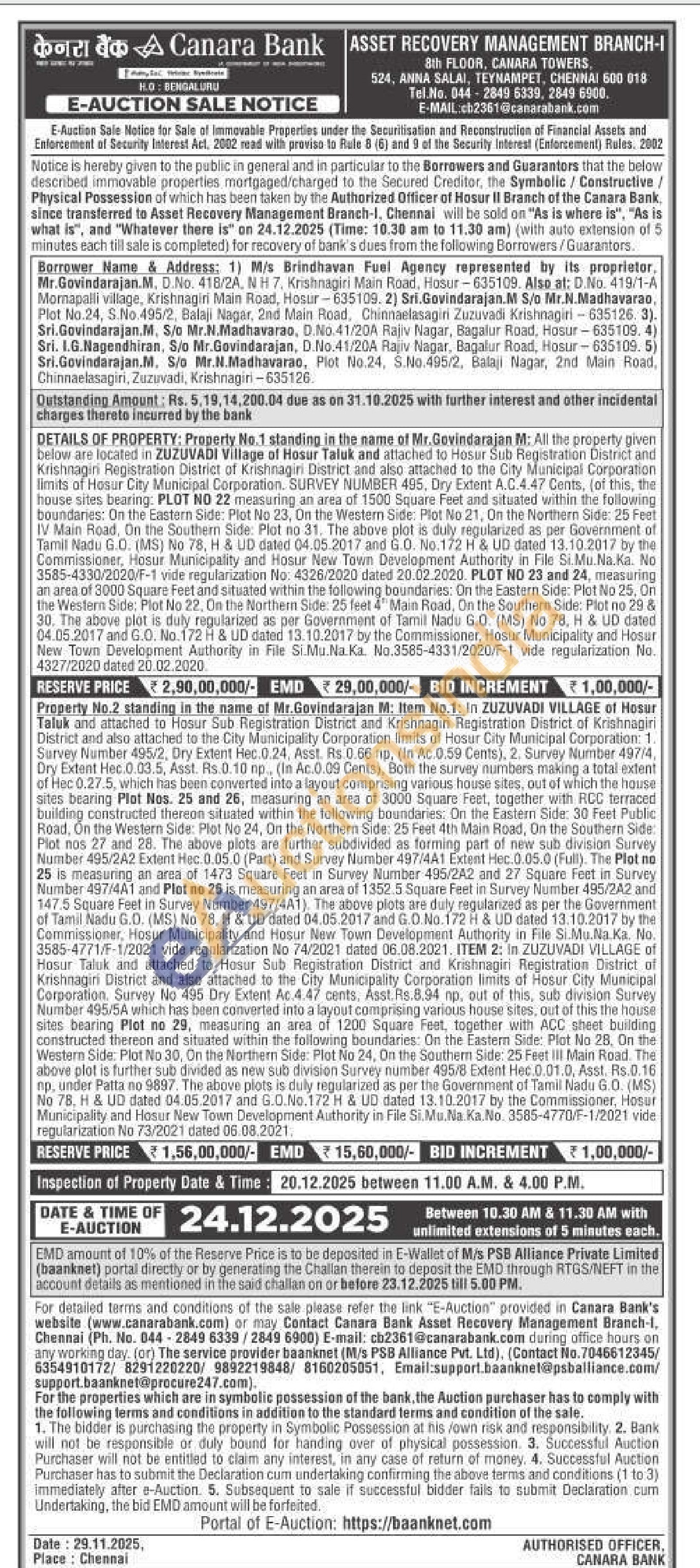 Property No.2 standing in the name of Mr.Govindarajan M: Item No.1: In ZUZUVADI VILLAGE of Hosur Taluk and attached to Hosur Sub Registration District and Krishnagiri Registration District of Krishnagiri District and also attached to the City Municipality Corporation limits of Hosur City Municipal Corporation: 1. Survey Number 495/2, Dry Extent Hec.0.24, Asst. Rs.0.66 пр, (Іл Ас.0.59 Cents), 2. Survey Number 497/4, Dry Extent Hec.0.03.5, Asst. Rs.0.10 np., (In Ac.0.09 Cents), Both the survey numbers making a total extent of Hec 0.27.5, which has been converted into a layout comprising various house sites, out of which the house sites bearing Plot Nos. 25 and 26, measuring an area of 3000 Square Feet, together with RCC terraced building constructed thereon situated within the following boundaries: On the Eastern Side: 30 Feet Public Road, On the Western Side: Plot No 24, On the Northern Side: 25 Feet 4th Main Road, On the Southern Side: Plot nos 27 and 28. The above plots are further subdivided as forming part of new sub division Survey Number 495/2A2 Extent Hec. 0.05.0 (Part) and Survey Number 497/4A1 Extent Hec.0.05.0 (Full). The Plot no 25 is measuring an area of 1473 Square Feet in Survey Number 495/2A2 and 27 Square Feet in Survey Number 497/4A1 and Plot no 26 is measuring an area of 1352.5 Square Feet in Survey Number 495/2A2 and 147.5 Square Feet in Survey Number 497/4A1). The above plots are duly regularized as per the Government of Tamil Nadu G.D. (MS) No 78, H & UD dated 04.05.2017 and G.O.No.172 H & UD dated 13.10.2017 by the Commissioner, Hosur Municipality and Hosur New Town Development Authority in File Si.Mu.Na.Ka. No. 3585-4771/F-1/2021 vide regularization No 74/2021 dated 06.08.2021, ITEM 2: In ZUZUVADI VILLAGE of Hosur Taluk and attached to Hosur Sub Registration District and Krishnagiri Registration District of Krishnagiri District and also attached to the City Municipality Corporation limits of Hosur City Municipal Corporation. Survey No 495 Dry Extent Ac.4.47 cents, Asst. Rs.8.94 np. out of this, sub division Survey Number 495/5A which has been converted into a layout comprising various house sites, out of this the house sites bearing Plot no 29, measuring an area of 1200 Square Feet, together with ACC sheet building constructed thereon and situated within the following boundaries: On the Eastern Side: Plot No 28, On the Western Side: Plot No 30, On the Northern Side: Plot No 24, On the Southern Side: 25 Feet III Main Road. The above plot is further sub divided as new sub division Survey number 495/8 Extent Hec.0.01.0, Asst. Rs.0.16 np, under Patta no 9897. The above plots is duly regularized as per the Government of Tamil Nadu G.O. (MS) No 78, H & UD dated 04.05.2017 and G.D.No.172 H & UD dated 13.10.2017 by the Commissioner, Hosur Municipality and Hosur New Town Development Authority in File Si. Mu.Na. Ka.No. 3585-4770/F-1/2021 vide regularization No 73/2021 dated 06.08.2021.