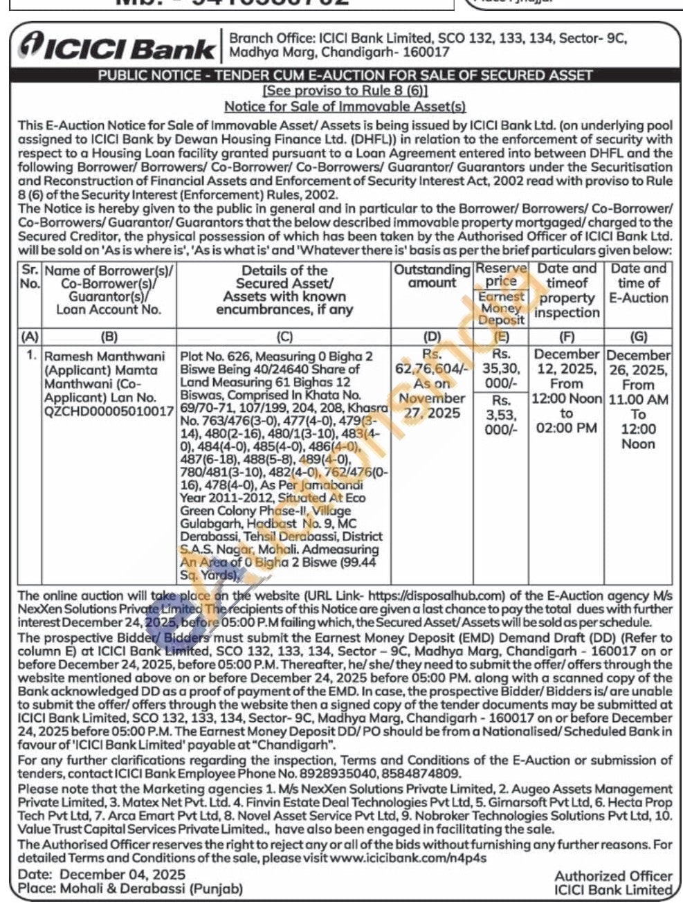 Plot No. 626, Measuring 0 Bigha 2 Biswe Being 40/24640 Share of Land Measuring 61 Bighas 12 Biswas, Comprised In Khata No. No. 763/476(3-0), 477(4-0), 479(3-14), 480(2-16), 480/1(3-10), 483(4-0), 484(4-0), 485(4-0), 486(4-0), 487(6-18), 488(5-8), 489(4-0), 780/481(3-10), 482(4-0), 762/476(0-16), 478(4-0), As Per Jamabandi Year 2011-2012, Situated At Eco Green Colony Phase-II, Village Gulabgarh, Hadbast No. 9, MC Derabassi, Tehsil Derabassi, District S.A.S. Nagar, Mohali. Admeasuring An Area of 0 Bigha 2 Biswe (99.44 Sq. Yards). Rs. 62,76,604/-As on November 27, 2025 (E) Rs. 35,30, 000/-Rs. 3,53, 000/- December 12, 2025, From 12:00 Noon to 02:00 PM December 26, 2025, From 11.00 AM To 12:00 Noon The online auction will take place on the website (URL