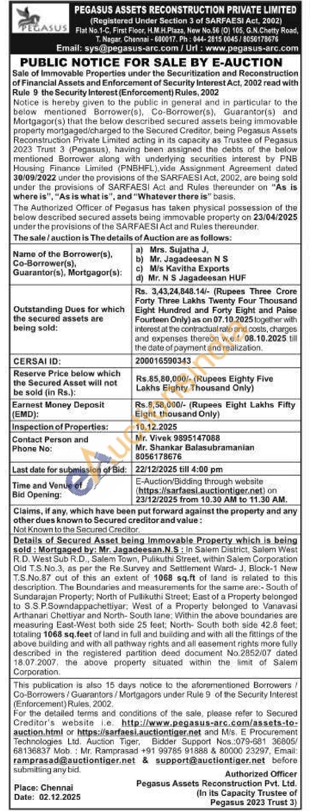 Details of Secured Asset being Immovable Property which is being sold: Mortgaged by: Mr. Jagadeesan.N.S: In Salem District, Salem West R.D. West Sub R.D., Salem Town, Pulikuthi Street, within Salem Corporation Old T.S.No.3, as per the Re Survey and Settlement Ward-J, Block-1 New T.S.No.87 out of this an extent of 1068 sq.ft of land is related to this description. The Boundaries and measurements for the same are:- South of Sundarajan Property; North of Pullikuthi Street, East of a Property belonged to S.S.P.Sowndappachettiyar, West of a Property belonged to Vanavasi Arthanari Chettiyar and North-South lane: Within the above boundaries are measuring East-West both side 25 feet, North South both side 42.8 feet; totaling 1068 sq.feet of land in full and building and with all the fittings of the above building and with all pathway rights and all easement rights more fully described in the registered partition deed document No.2852/07 dated 18.07.2007, the above property situated within the limit of Salem Corporation.
