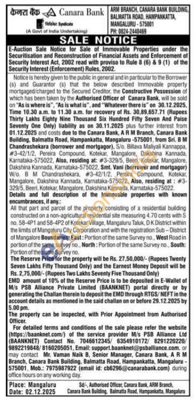 All that part and parcel of the property consisting of a residential building constructed on a non-agricultural residential site measuring 4.70 cents with S no. 58-4P1 and 58-4P2 of Kotekar Village, Mangaluru Taluk, DK District within the limits of Mangaluru City Corporation and with the registration Sub-District of Mangalore Boundaries: East: Portion of the same Survey no., West Road in portion of the same survey no., North: Portion of the same Survey no., South: Portion of the same Survey no.