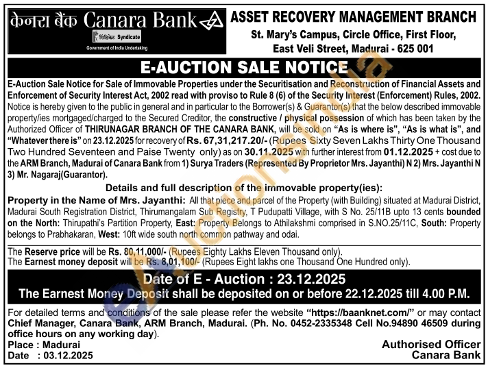 Property in the name of Mr. Senthilvel K: All the part and parcel of the property situated in Madurai District, Madurai South Registration District, Madurai Sub-Registration District, Madurai South Taluk, Nallur Village, in Old Patta No. 1187, New Patta No. 1410, Punjai Re-Survey No. 261/1A measuring Hectare 1.37.0 i.e., Acre 3 Cents 38 out of which on the Southern side an extent of 1 Acre and 50 Cents has been bifurcated into number of plots out of which Plot No. 14 which as per sub-division in Patta No. 1782 in UDR Survey No. 261/1A2, New Re-Survey No. 261/1A2A and the superstructure constructed thereon is