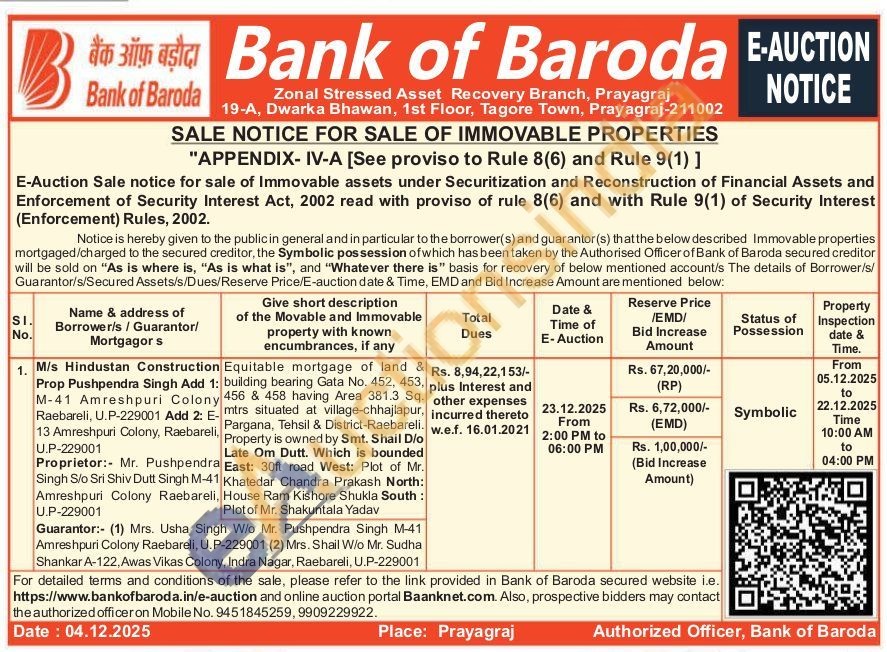 Equitable mortgage of land & building bearing Gata No. 452, 453. 456 & 458 having Area 381.3 Sq. mtrs situated at village-chhajlapur, Pargana, Tehsil & District-Raebareli. Property is owned by Smt. Shail D/o Late Om Dutt. Which is bounded East: 30ft road West: Plot of Mr. Khatedar Chandra Prakash North: House Ram Kishore Shukla South: Plot of Mr. Shakuntala Yadav