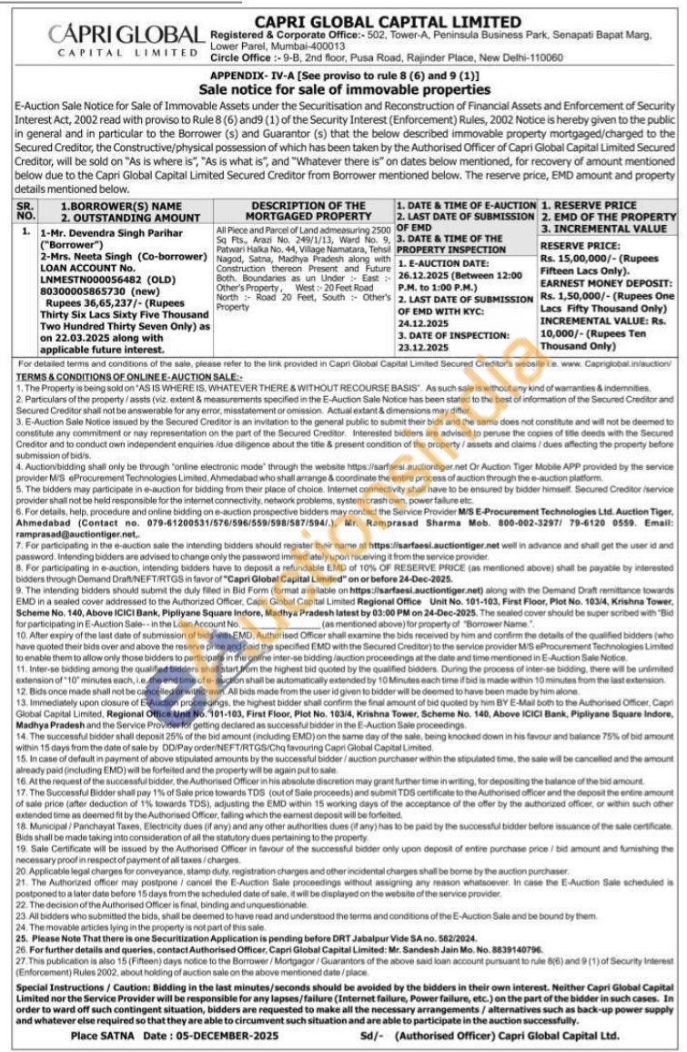 All Piece and Parcel of Land admeasuring 2500 Sq Fts, Arazi No. 249/1/13 249/1/13, Ward No. No. 9. 9. Patwari Halka No. 44, Village Namatara, Tehsil Nagod, Satna, Madhya Pradesh along with Construction thereon Present and Future Both Boundaries as un Under East Other's Property, West 20 Feet Road North Road 20 Feet, South Other's Property