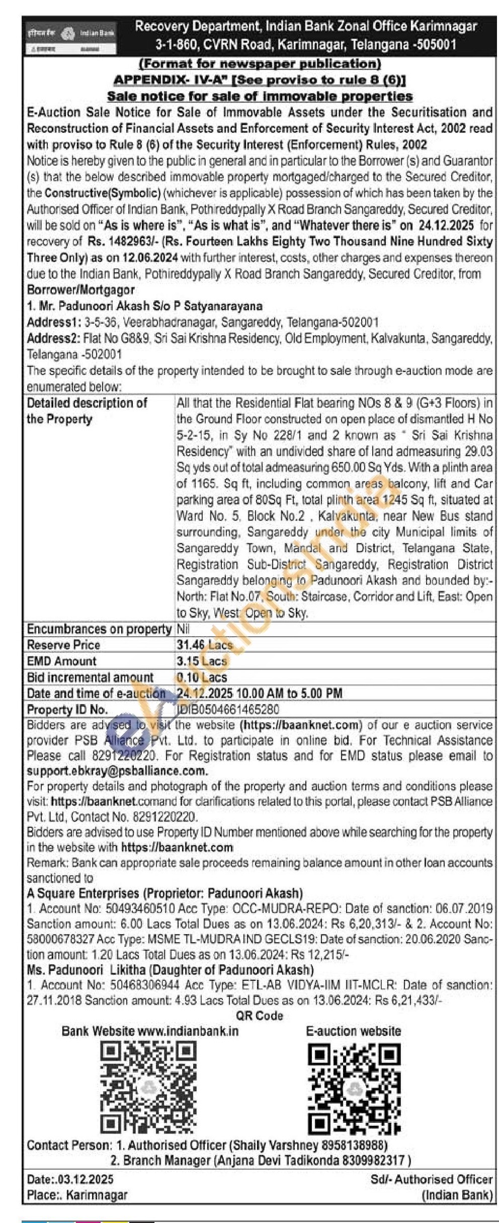All that the Residential Flat bearing NOs 8 & 9 (G+3 Floors) in the Ground Floor constructed on open place of dismantled H No 5-2-15, in Sy No 228/1 and 2 known as Sri Sai Krishna Residency with an undivided share of land admeasuring 29.03 Sq yds out of total admeasuring 650.00 Sq Yds. With a plinth area of 1165. Sq ft, including common areas balcony, lift and Car parking area of 80Sq Ft, total plinth area 1245 Sq ft. situated at Ward No. 5. Block No.2, Kalvakunta, near New Bus stand surrounding, Sangareddy under the city Municipal limits of Sangareddy Town, Mandal and District, Telangana State, Registration Sub-District Sangareddy, Registration District Sangareddy belonging to Padunoori Akash and bounded by:-North: Flat No.07, South: Staircase, Corridor and Lift East: Open to Sky, West: Open to Sky.