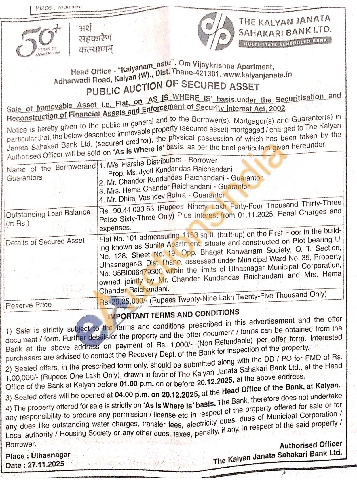 Flat No. 101 admeasuring 1153 sq.ft. (built-up) on the First Floor in the build-ing known as Sunita Apartment, situate and constructed on Plot bearing U. No. 128, Sheet No. 19, Opp. Bhagat Kanwarram Society, O. T. Section, Ulhasnagar-3, Dist. Thane, assessed under Municipal Ward No. 35, Property No. 35B1006479300 within the limits of Ulhasnagar Municipal Corporation, owned jointly by Mr. Chander Kundandas Raichandani and Mrs. Hema Chander Raichandani