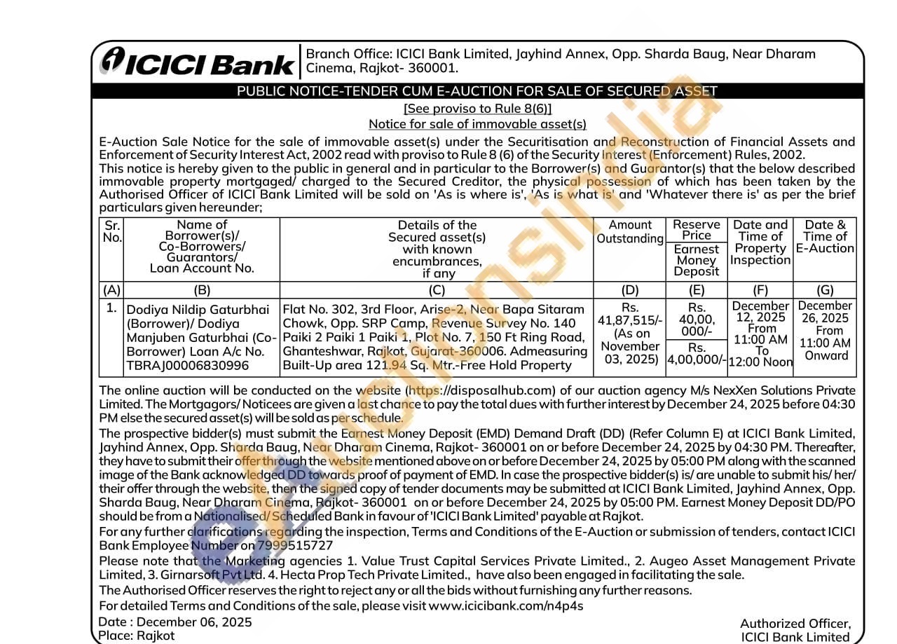 Flat No. 302, 3rd Floor, Arise-2, Near Bapa Sitaram Chowk, Opp. SRP Camp, Revenue Survey No. 140 Paiki 2 Paiki 1 Paiki 1, Plot No. 7, 150 Ft Ring Road, Ghanteshwar, Rajkot, Gujarat-360006. Admeasuring Built-Up area 121.94 Sq. Mtr.-Free Hold Property