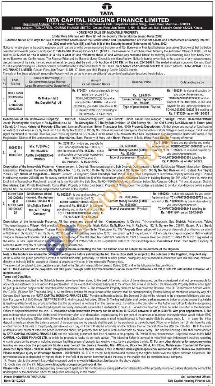 Description of the Immovable Property: All that piece and parcel of the Kramanumber: 1; District: Thiruvananthapuram: Sub District: Pothencode: Taluk: Thiruvananthapuram; Village: Melthonnakkal, Panchayath: Pothencode; Muri: Kallor, Re.Sy.Block No: 5; Re.Sy.No: 112/11; Survey No: 2381/1; Extent (Are / Sqm): 8.85Ares; Nature of Avagasham - Tharam: Pandarapattam-Purayidam Seller Thandaper No: 1397 Property Description:- All that piece and parcels of land having an extent of 8.85 Ares in Sy.No.2381/1 and Re Sy. No, 112/11 together with building bearing No. 15/381 along with right of way situated in Pothencode Panchayath located in Melthonnakkal village in Thiruvananthapuram Taluk and all rights mentioned in the Gift Deed No. 1044/1979 dated 07.05.1979 & Release Deed No.5056/2010 dated 15.12.2010 registered in the name of Mrs. Sajida Beevi in Sub-Registration District of Pothencode in the Registration district of Thiruvananthapuram... Boundaries: East: Road North: Property of Nazeeha West: Property of Sidhique South: Property of Nazeeha