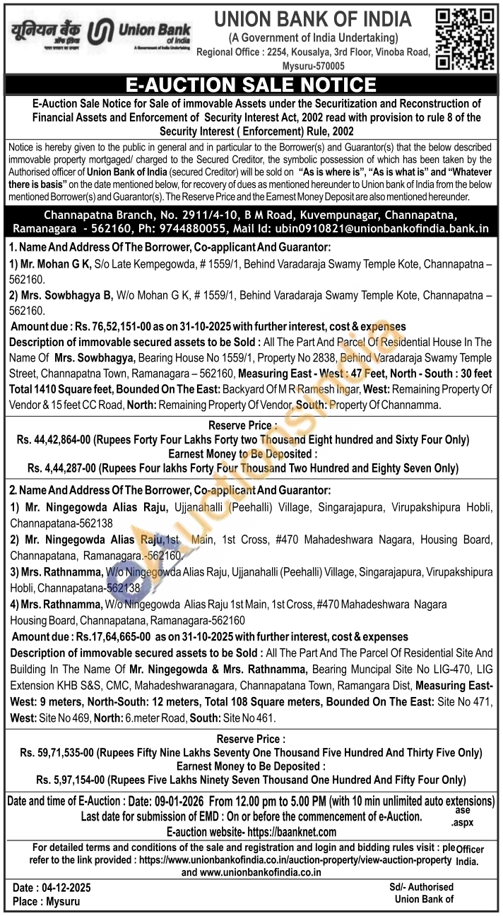 Description of immovable secured assets to be Sold: All The Part And The Parcel Of Residential Site And Building In The Name Of Mr. Ningegowda & Mrs. Rathnamma, Bearing Muncipal Site No LIG-470, LIG Extension KHB S&S, CMC, Mahadeshwaranagara, Channapatana Town, Ramangara Dist, Measuring East-West: 9 meters, North-South: 12 meters, Total 108 Square meters, Bounded On The East: Site No 471, West: Site No 469, North: 6.meter Road, South: Site No 461.