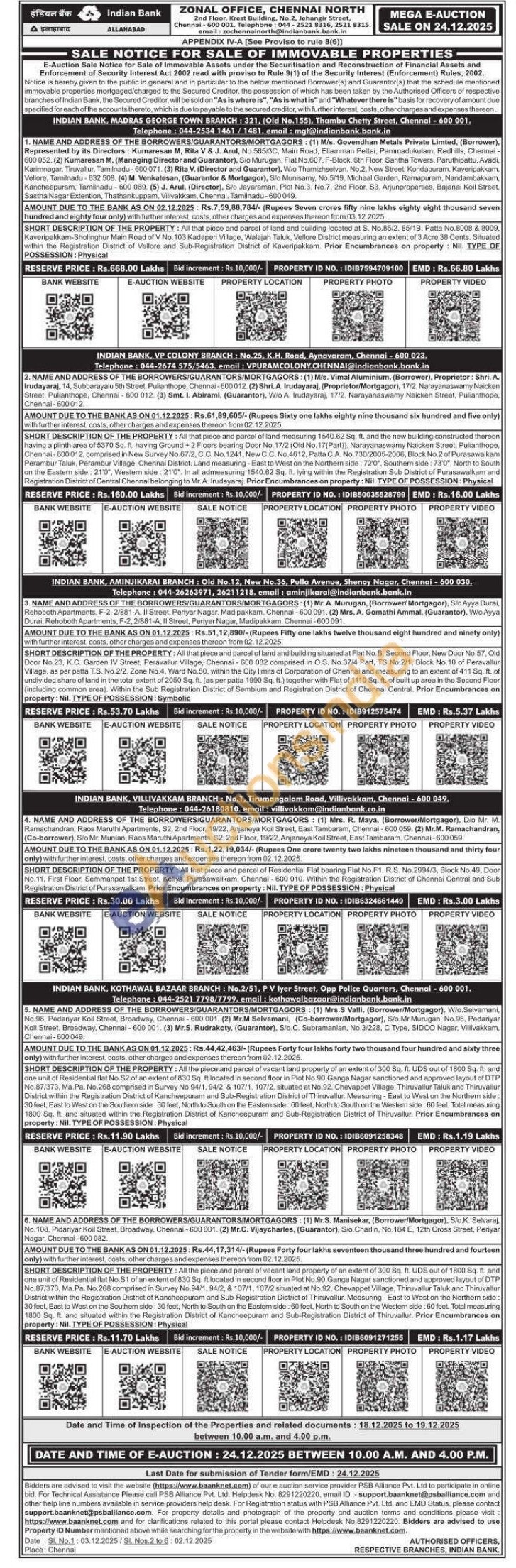 3) All that piece and parcel of land and building situated at Flat No. B. Second Floor, New Door No. 57, Old Door No. 23, K.C. Garden IV Street, Peravallur Village, Chennai-600 682 comprised in O.S. No.3714 Part, TS No.2/1, Block No.10 of Peravallur Village, as per patta T.S. No.2:2, Zone No. 4, Ward No.50, within the City limits of Corporation of Chennai and measuring to an extent of 411 Sq. ft. of undivided share of land in the total extent of 2050 Sq. ft. (as per patta 1990 Sq. ft) together with Flat of 1110 Sq. ft. of built up area in the Second Floor (including common area). Within the Sub Registration District of Sembium and Registration District of Chennai Central. Prior Encumbrances on property: Nil. TYPE OF POSSESSION: Symbolic