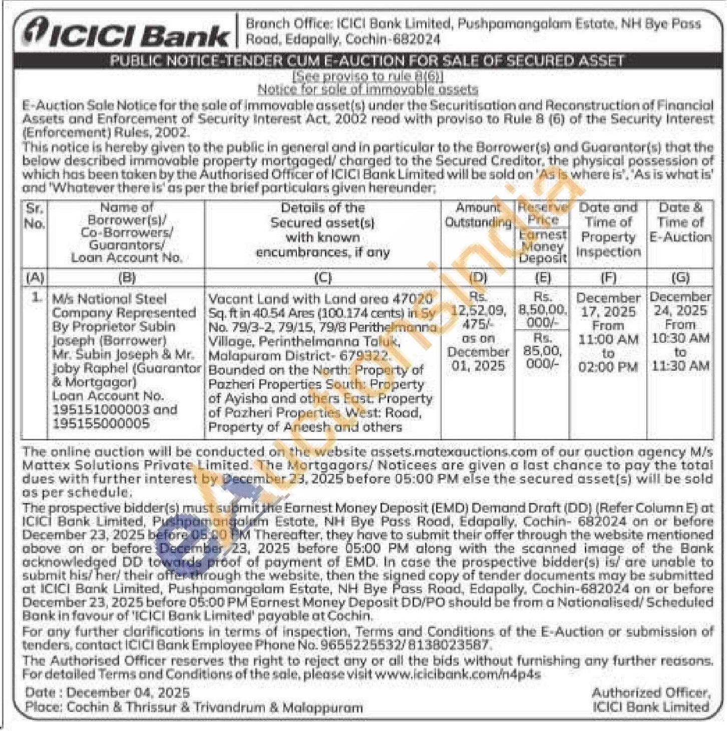 Vacant Land with Land area 47020 Sq. ft in 40.54 Ares (100.174 cents) in Sy No. 79/3-2, 79/15, 79/8 Perithelmanna Village, Perinthelmanna Taluk, Amalapuram District-679322. Bounded on the North: Property of Pazheri Properties South: Property of Ayisha and others East: Property of Pozheri Properties West: Road, Property of Aneesh and others