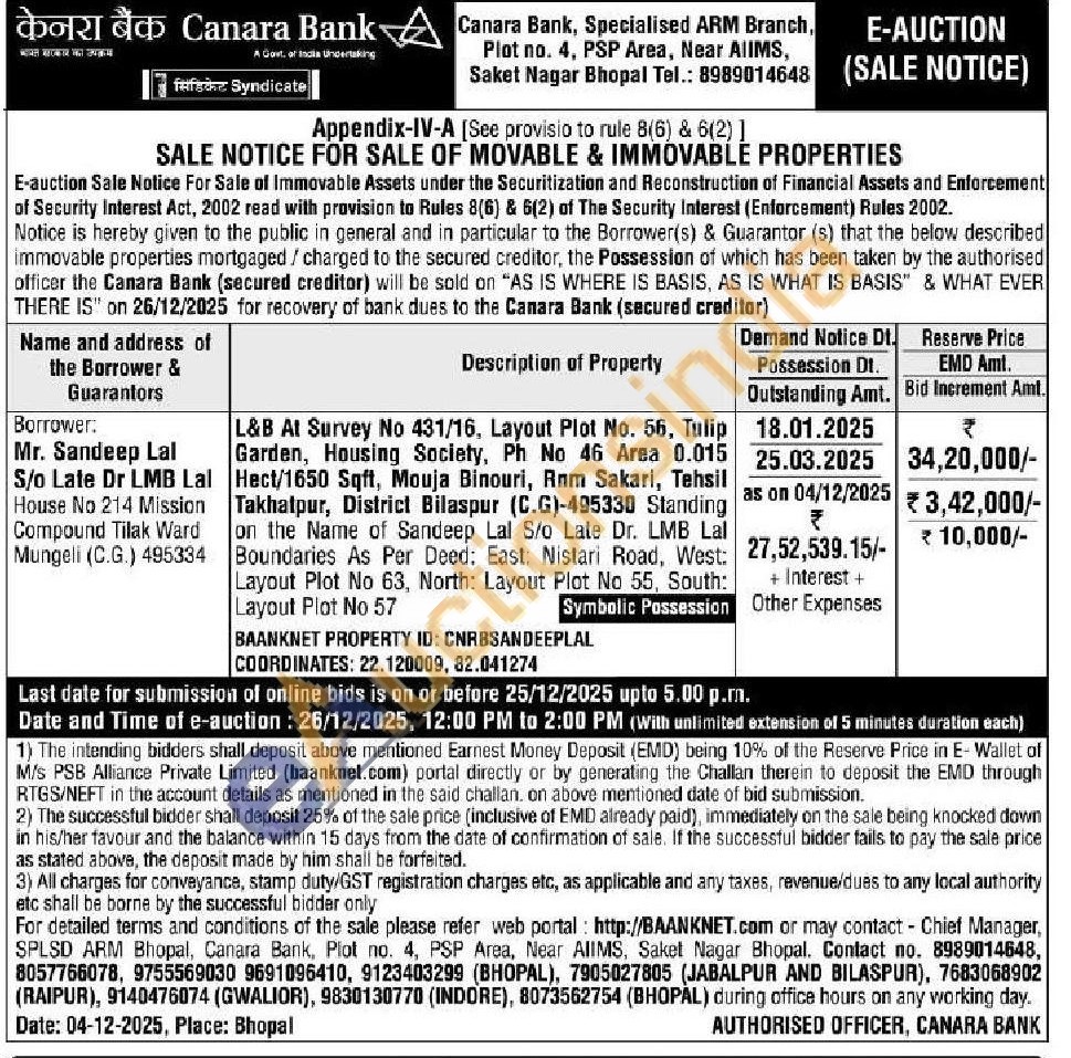 L&B At Survey No 431/16, Layout Plot No. 56, Tulip Garden, Housing Society, Ph No 46 Area 0.015 Hect/1650 Sqft, Mouja Binouri, Rnm Sakari, Tehsil Takhatpur, District Bilaspur (C.G)-495330 Standing on the Name of Sandeep Lal S/o Late Dr. LMB Lal Boundaries As Per Deed: East: Nistari Road, West: Layout Plot No 63, North: Layout Plot No 55, South: Layout Plot No 57