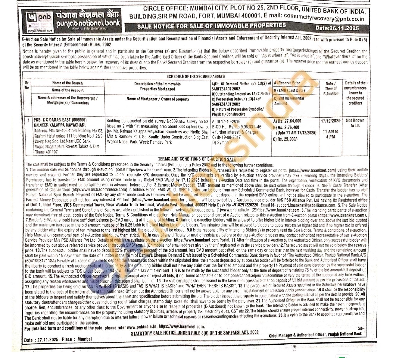 Contact E mail: comumcityrecovery@pnb.co.in