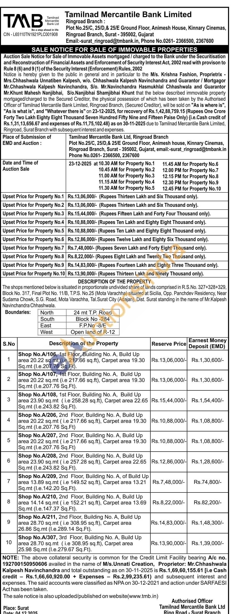 The shops mentioned below is situated in proportionate undivided share of lands comprised in R.S.No. 327+328+329 Block No. 317, Final Plot No. 11/B, T.P.S. No.25 (Mota Varachha) situated at Sicilia, Opp. Panchdev Residency, Nea Sudama Chowk, S.G. Road, Mota Varachha, Tal. Surat City (Adajan), Dist. Surat standing in the name of Mr.Kalpes Navinchandra Chhashwala. Shop No.A/107, 1st Floor, Building No. A, Build Up area 20.22 sq.mt (i.e 217.66 sq.ft), Carpet area 19.30 Sq.mt (l.e.207.76 Sq.Ft).