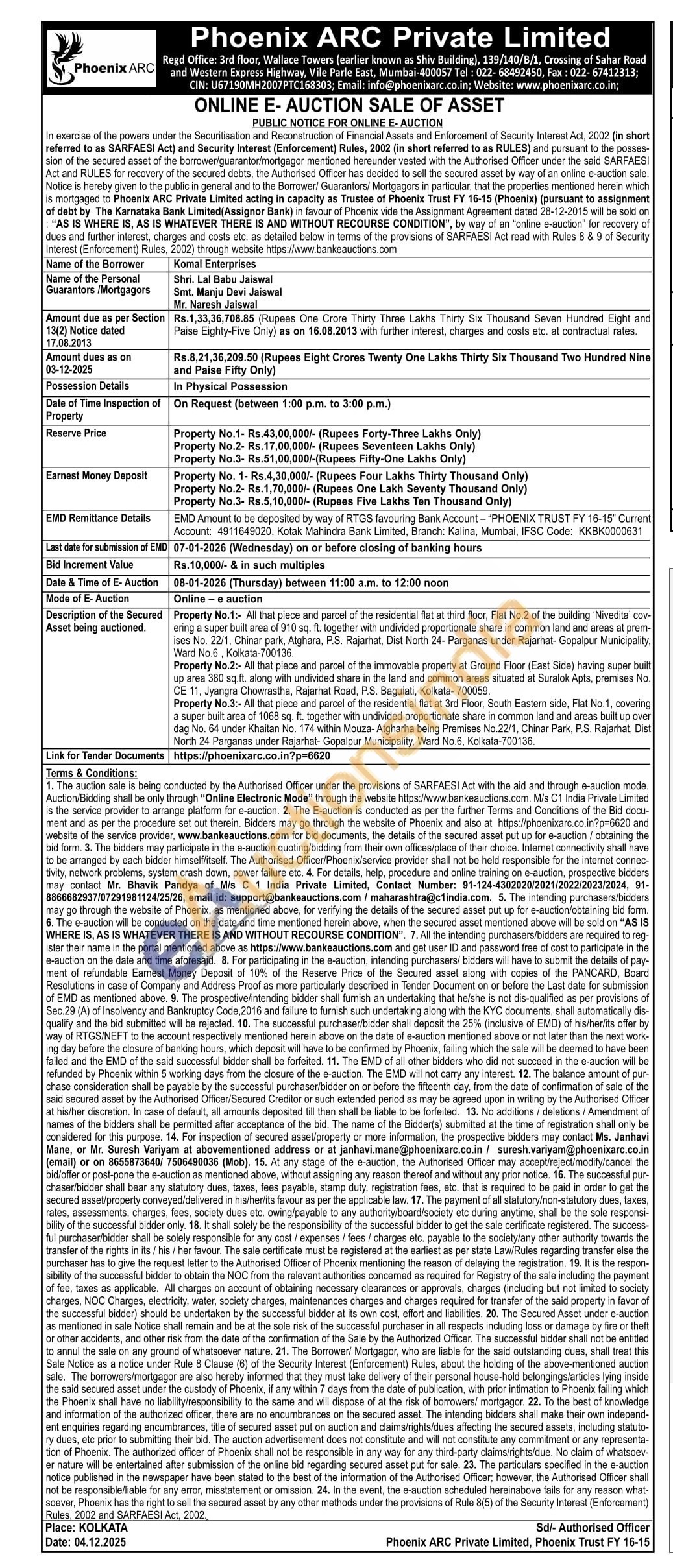 Property No.3:- All that piece and parcel of the residential flat at 3rd Floor, South Eastern side, Flat No.1, covering a super built area of 1068 sq. ft. together with undivided proportionate share in common land and areas built up over dag No. 64 under Khaitan No. 174 within Mouza-Atgharha being Premises No.22/1, Chinar Park, P.S. Rajarhat, Dist North 24 Parganas under Rajarhat- Gopalpur Municipality, Ward No.6, Kolkata-700136.