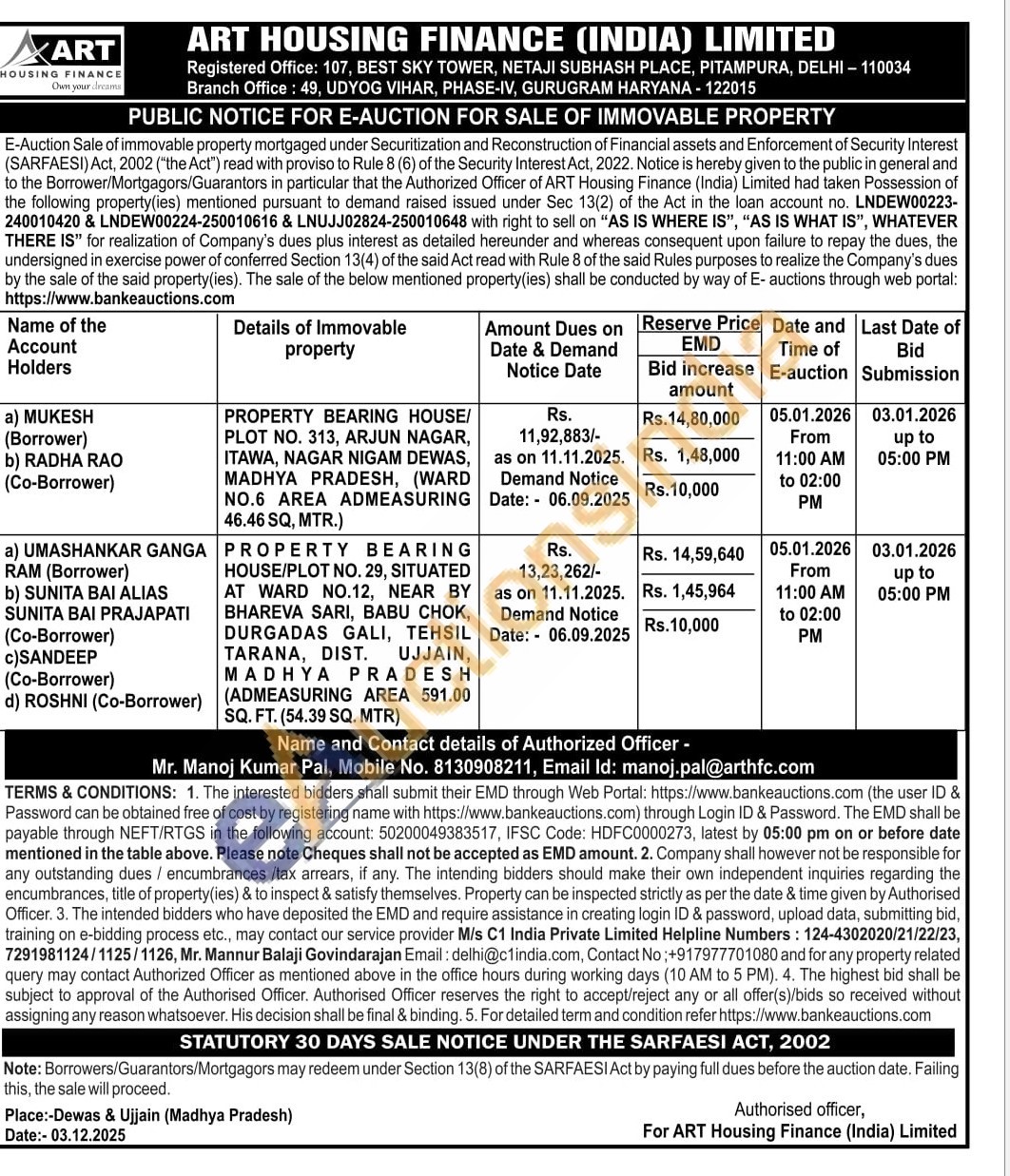 PROPERTY BEARING HOUSE/PLOT NO. 29, SITUATED AT WARD NO.12, NEAR BY BHAREVA SARI, BABU CHOK, DURGADAS GALI, TEHSIL TARANA, DIST. UJJAIN, MADHYA PRADESH (ADMEASURING AREA 591.00 SQ. FT. (54.39 SQ. MTR)