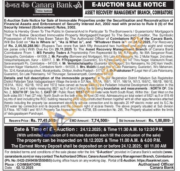 In Tirupur Registration District Palladam Sub Registration District Palladam Taluk Vadugapalayam Village the lands in S.F.Nos. 167/1A, 168/1, 161/1, 166/14, 161/3, 166/10, 166/18, 166/1E, 163/1A, 163/2, 162/1B, 161/2 and 157/2 have carved as house sites by the Palladam Industrial Development Association In this Site Nos. 3 and 4 totally measuring 8821 sq.ft of land having the following boundaries and measurements: NORTH OF: Site No. 2, SOUTH OF: Site No. 5, EAST OF: Public Road, WEST OF: 15 meter wide North South Road, Within this: East West on the both sides 89,1 Feet (27 mts) North South on the both sides 99 Feet (30 mts). Admeasuring an total extent of 8821 sq.ft or 819.49 sq.mts of land including the ROC building measuring 2430 sq.ft constructed thereon together wiht all other appurtenances attached thereto induding the property tax assessment electricity service connection and its deposits 20 HP electric motor and its S.C.No 295 water tap connection and its deposits and the common right of access thereto. The above property situated at Sub division S.F.Nos. 167/1AB1 and 161/1 Property Tax Assessment No. 62738, EB connection No. 295, The Property situated within the limits of Vadugapalayam Panchayat