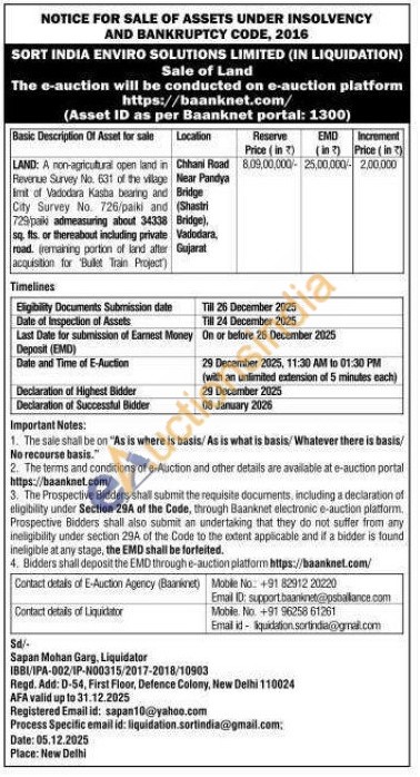 LAND: A non-agricultural open land in Revenue Survey No. 631 of the village Imit of Vadodara Kasba bearing and City Survey No. 726/paiki and 729 paik admeasuring about 34338 sq. fts or thereabout including private road (remaining portion of land alter acquisition for Bullet Train Project)