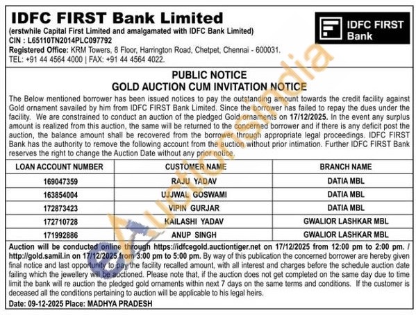 IDFC First Bank Ltd Gold Auctions Auction in Chennai