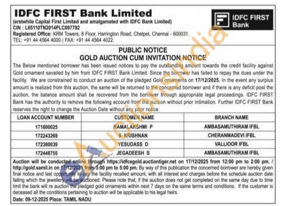 IDFC First Bank Ltd Gold Auctions Auction in Chennai