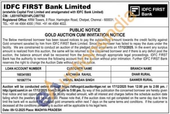 IDFC First Bank Ltd Gold Auctions Auction in Dhar