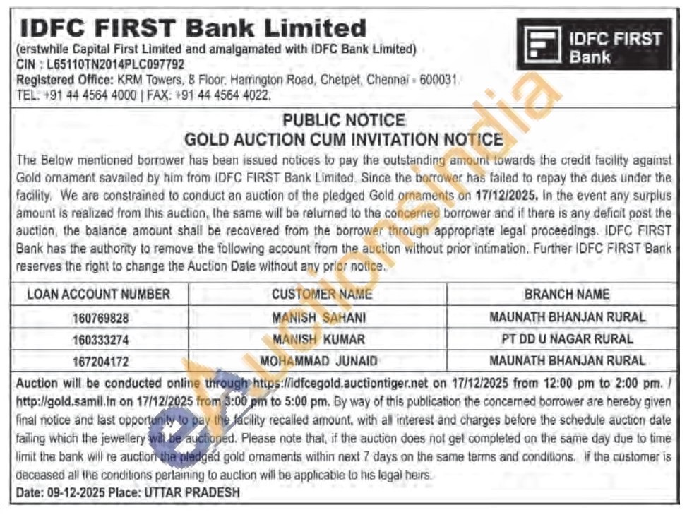 IDFC First Bank Ltd Gold Auctions Auction in Chennai