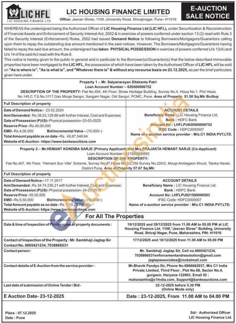 Flat No.407, 4th Floor, "Hemant Sun Ville" Scheme, Survey No.97, Hissa No.2/2, Old Survey No.220/2, Mouje Ambegaon Khurd, Taluka Haveli, District Pune. Area of Property 57.67 Sq.Mtr