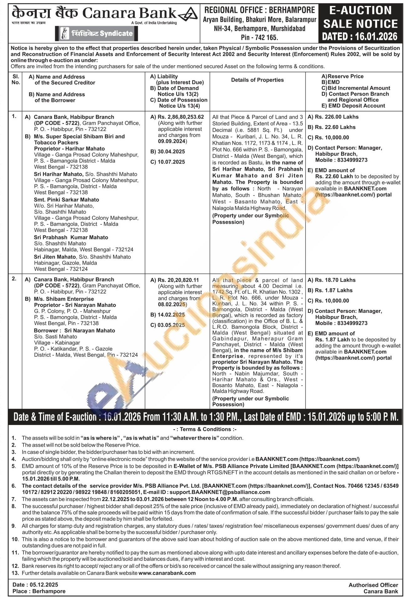 All that piece & parcel of land measuring about 4.00 Decimal i.e. 1742 Sq. Ft. of L. R. Khatian No. 1302, L. R. Plot No. 666, under Mouza Kuriban, J. L. No. 34 within. P. S. -Bamongola, District Malda (West Bengal), which is recorded as factory (classification) in the Office of B. L. &L.R.O. Bamongola Block, District -Malda (West Bengal) situated at E) Gabindapur, Maherapur Gram Panchayet, District Malda (West Bengal), in the name of M/s Shibam Enterprise, represented by it's proprietor Sri Narayan Mahato. The Property is bounded by as follows:North Nabin Majumdar, South Harihar Mahato & Ors, West Bosanto Mahato, East Nalagola Malda Highway Road.