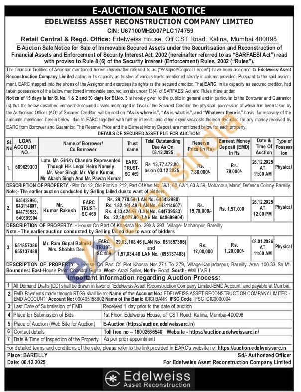 DESCRIPTION OF PROPERTY: House On Part Of Plot Khasra Nos 271 To 279, Village-Kanjadaspur, Bareilly. Area 100.33 Sq.Mt. Boundries: East-House Prem Chandra Gupta, West- Arazi Seller, North-Road, South-Wall LV.R.I.