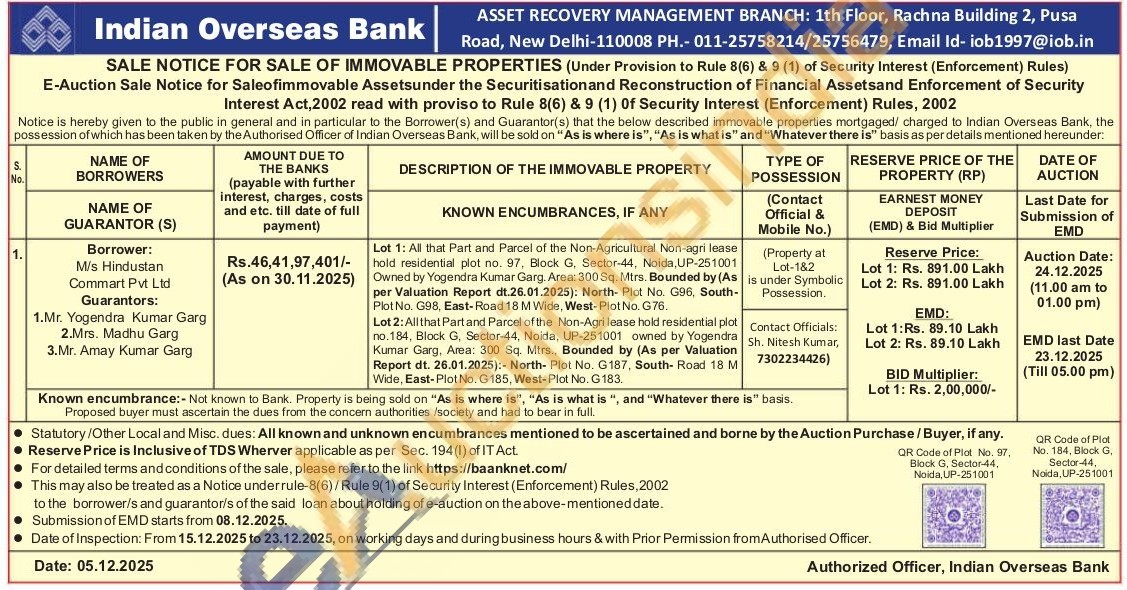 Lot 1: All that Part and Parcel of the Non-Agricultural Non-agri lease hold residential plot no. 97, Block G, Sector-44, Noida, UP-251001 Owned by Yogendra Kumar Garg. Area: 300 Sq. Mtrs. Bounded by (As per Valuation Report dt.26.01.2025): North- Plot No. G96, South-Plot No. G98. East-Road 18 M Wide, West-Plot No. G76