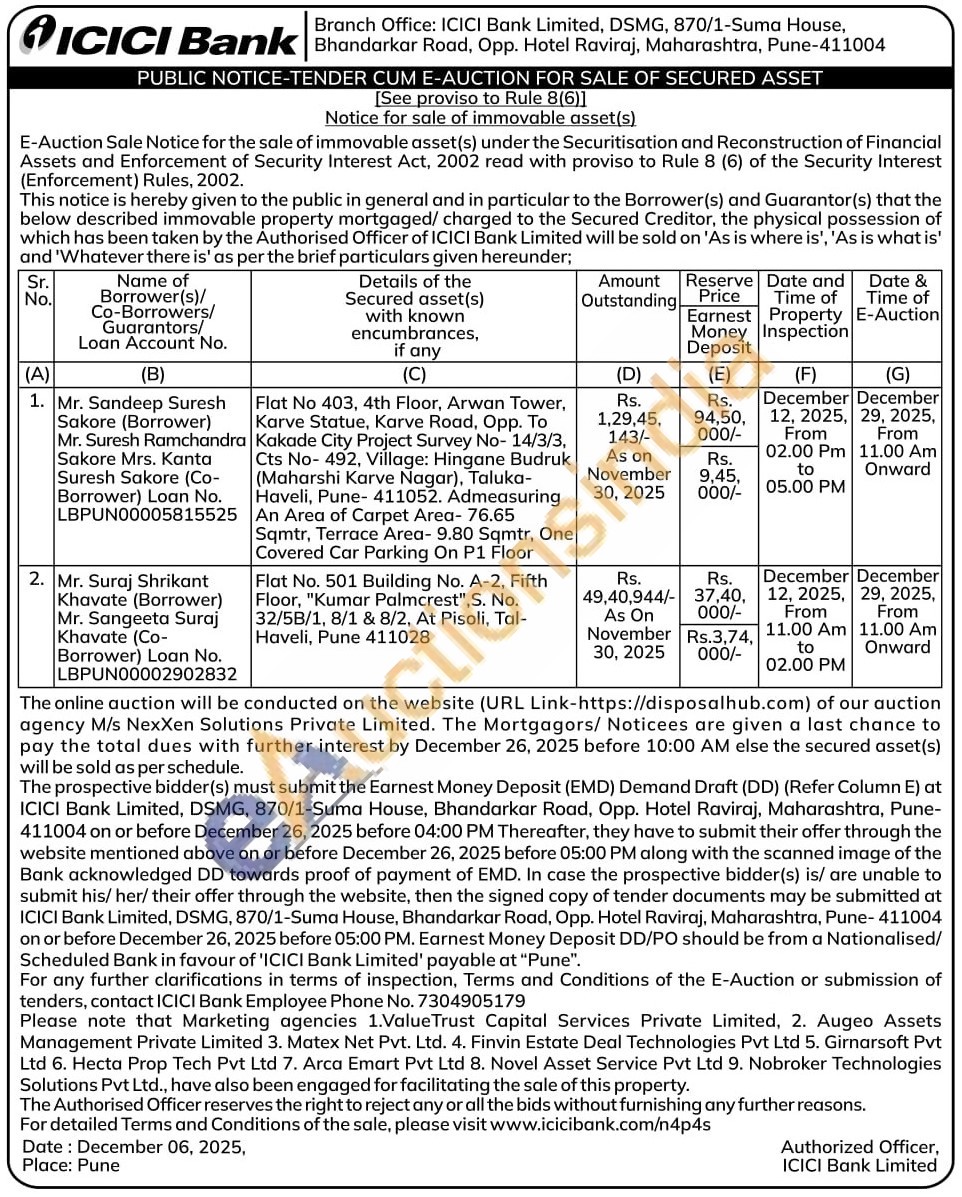 Flat No 403, 4th Floor, Arwan Tower, Karve Statue, Karve Road, Opp. To Kakade City Project Survey No- 14/3/3, Cts No- 492, Village: Hingane Budruk (Maharshi Karve Nagar), Taluka-Haveli, Pune-411052. Admeasuring An Area of Carpet Area-76.65 Sqmtr, Terrace Area- 9.80 Sqmtr, One Covered Car Parking On P1 Floor