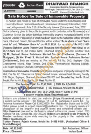 Description of immovable Property: All that piece and parcel of property bearing RS No 26/2, Plot No. 62, "Channamma Nilaya", Behind Temple, Vishwabharati Housing Society CB. Nagar, Saptapur, Dhanwad, Kamataka-580 001 and Bounded by: North: Road, South. Plot No. 61, East: Plot No. 59, West: Plot No. 63