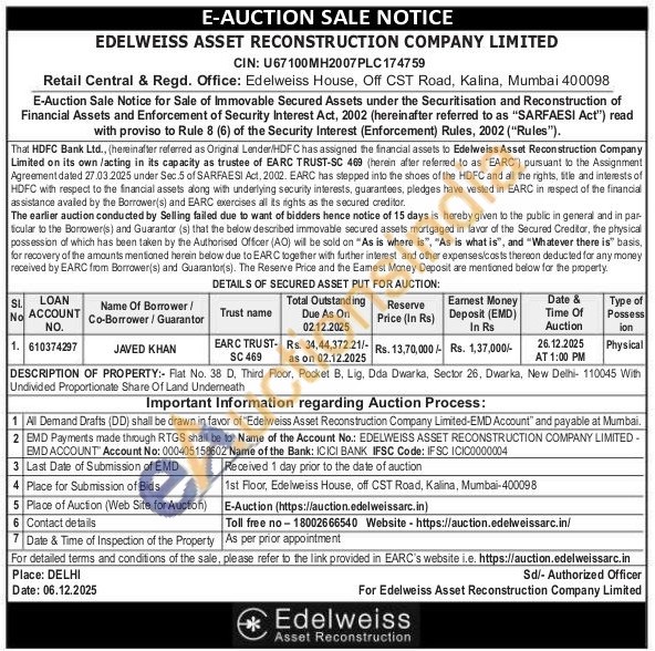 DESCRIPTION OF PROPERTY:- Flat No. 38 D. Third Floor, Pocket B, Lig, Dda Dwarka, Sector 26, Dwarka, New Delhi-110045 With Undivided Proportionate Share Of Land Underneath