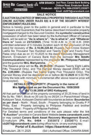 DETAILS OF PROPERTY: (Property in the name of Mrs Mariyamma as per the Document No. 1958/2008 dtd 13.08.2008 of SRO Kottayam): All that part and parcel of the property consisting of 20.25 Ares of land in Re Sy No. 786/1, Block no 20 (old Sy no 26/2A) in Panachikkad Village, Kottayam Taluk, Kottayam District with boundaries as below: Boundaries as per deed North Road, South Property belonging to Oriattu P P Philip, East Property belonging to Philipose Padikkal and brother Markose, West: Property of Philipose Padikkal.