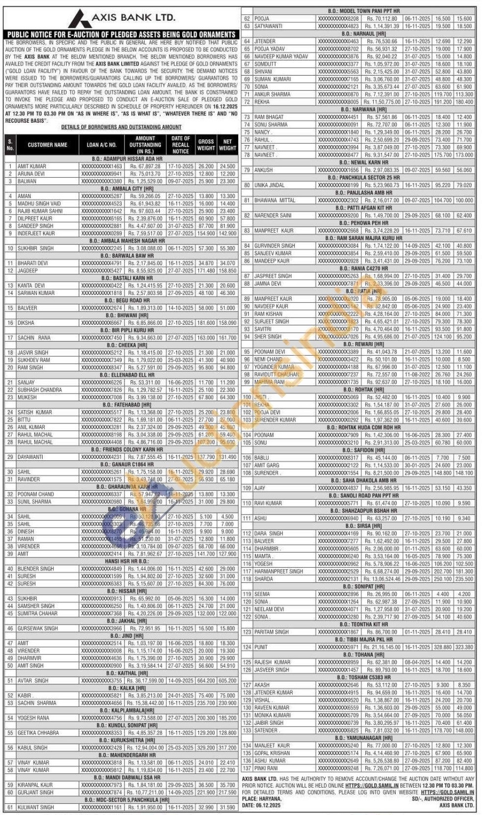 Axis Bank Gold Auctions Auction in Hisar