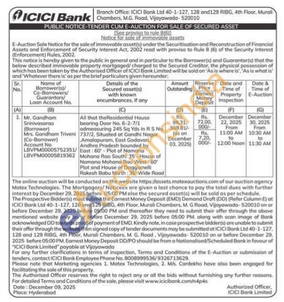 All that theResidential House bearing Door No. 6-2-7/1 admeasuring 245 Sq Yds in RS No. 737/2, Situated at Gandhi Nagar Amalapuram, East Godavari, Andhra Pradesh bounded by East: 60-Plot of Namana Mohana Rao South: 35- House of Namana Mohana Rao West: 60° Plot and House of Daggumelli Rakesh Babu North: 35 Wide Road
