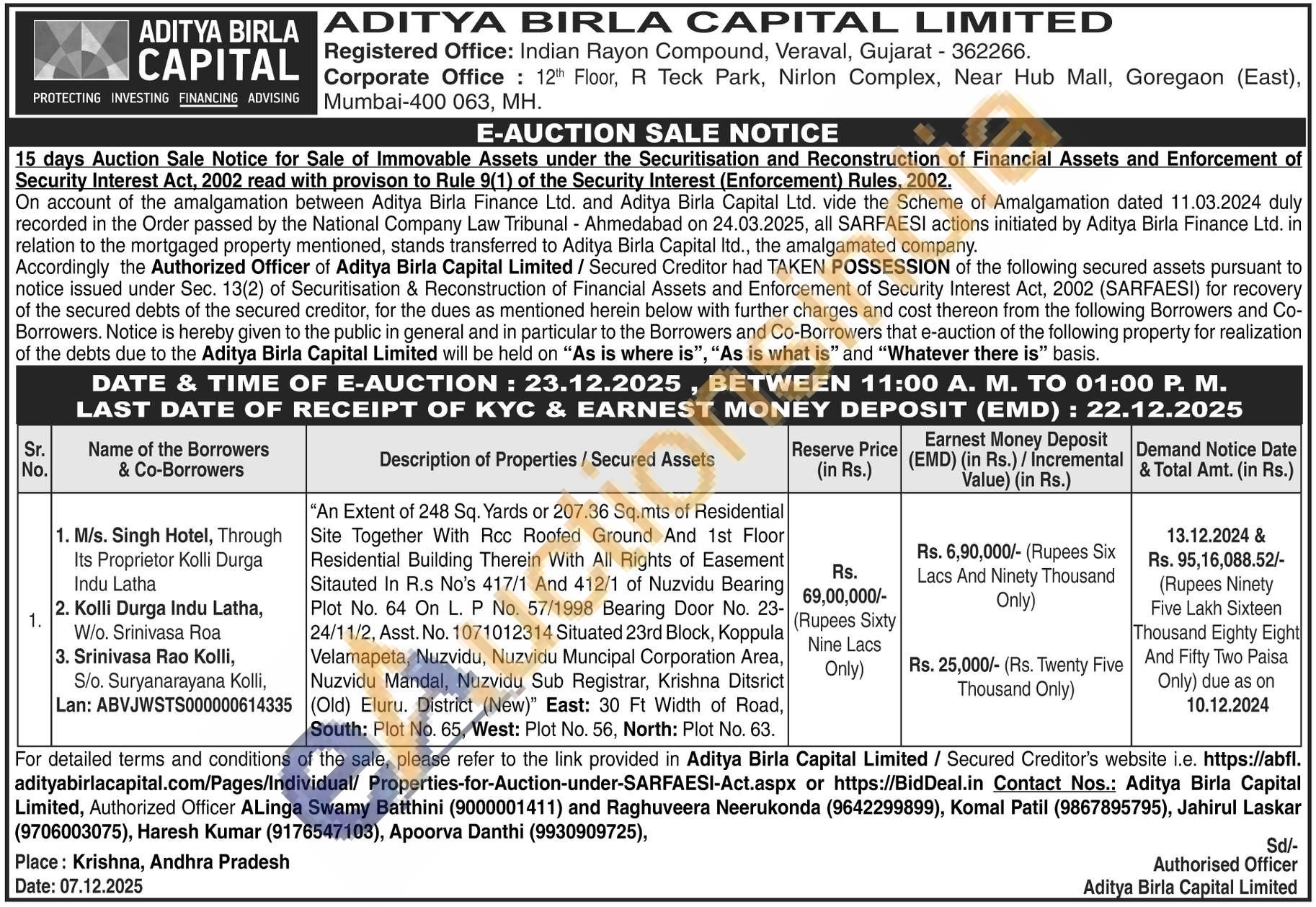 Authorized Officer ALinga Swamy Batthini (9000001411) / Raghuveera Neerukonda (9642299899)/ Komal Patil (9867895795) / Jahirul Laskar (9706003075) / Haresh Kumar (9176547103) / Apoorva Danthi (9930909725)