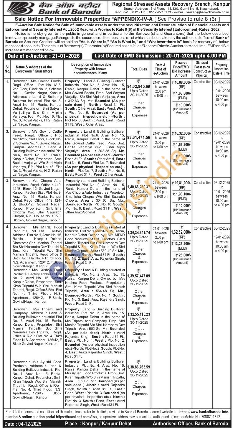 Property: Land & Building situated at Industrial Plot No.1 Arazi No. 15, Rania, Kanpur Dehat Owned by: M/s MTND Food Products Pvt Ltd., Directors: Shri Manish Tripathi S/o Shri Narendra Dev Tripathi & Smt. Kiran Tripathi W/o Shri Manish Tripathi, Area: 580.40 Sq. Mtr., Bounded-North: Road 31 Ft., South: Plot No. 2, East: Arazi Rajendra Singh, West: Road 31 Ft