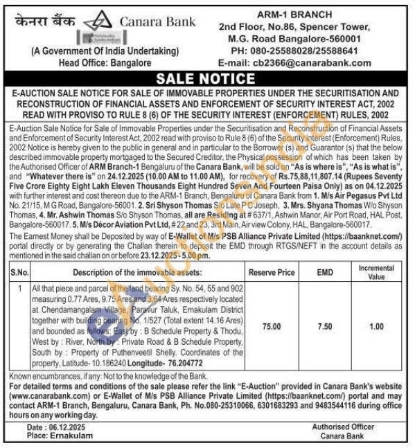 All that piece and parcel of the land bearing Sy. No. 54, 55 and 902 measuring 0.77 Ares, 9.75 Ares and 3.64 Ares respectively located at Chendamangalam Village, Paravur Taluk, Emakulam District together with building bearing No. 1/527 (Total extent 14.16 Ares) and bounded as follows: East by: B Schedule Property & Thodu, West by: River, North by Private Road & B Schedule Property, South by Property of Puthenveetil Shelly. Coordinates of the property, Latitude-10.186240 Longitude- 76.204772