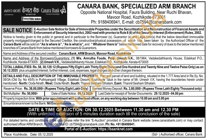 DETAILS AND FULL DESCRIPTION OF THE IMMOVABLE PROPERTY: Part and parcel of land and building, situated in the 1.777 Ares land in Re.Sy. No. 39/3A (Old Sy. No 45/5) in Puthiyangadi Village, Edakkad Desom, Kozhikode Taluk in the name of Mr. Umesh V.K. having the bounderies herein under mentioned:-North: Oode Nirath, West: Oode Nirath, South: Thannil Sesham Sthalam, Eash: Thannil Sesham Sthalam
