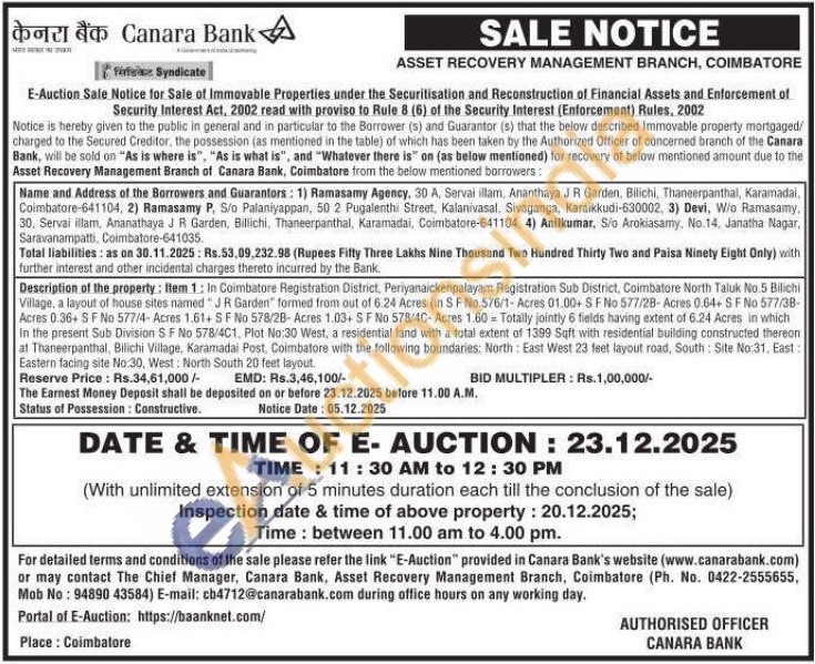 Description of the property: Bem 1: In Coimbatore Registration District, Periyanaickenpalayam Registration Sub District, Coimbatore North Taluk No.5 Bilichi Village, a layout of house sites named "JR Garden" formed from out of 6.24 Acres (in SF No.576/1-Acres 01.00+ SF No 577/28-Acres 0.64+ SF No 577/38-Acres 0.36+ SF No 577/4-Acres 1.61+ SF No 578/28-Acres 1.03+ SF No 578/4C-Acres 1.60 Totally jointly 6 fields having extent of 6.24 Acres in which In the present Sub Division SF No 578/4C1, Plot No:30 West, a residential land with a total extent of 1399 Sqft with residential building constructed thereon at Thaneerpanthal, Bilichi Village, Karamadai Post. Coimbatore with the following boundaries: North East West 23 feet layout road, South Site No:31. East: Eastern facing site No:30, West: North South 20 feet layout