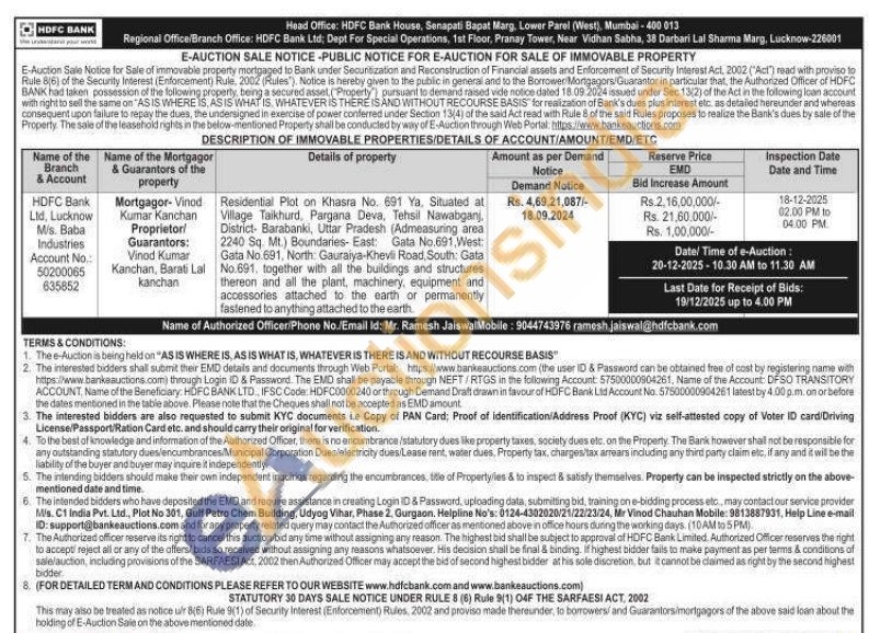 Residential Plot on Khasra No. 691 Ya, Situated at Village Taikhurd, Pargana Deva, Tehsil Nawabganj, District Barabanki, Uttar Pradesh (Admeasuring area 2240 Sq. Mt.) Boundaries- East: Gata No.691, West: Gata No.691, North: Gauraiya-Khevli Road, South: Gata No.691, together with all the buildings and structures thereon and all the plant, machinery, equipment and accessories attached to the earth or permanently fastened to anything attached to the earth