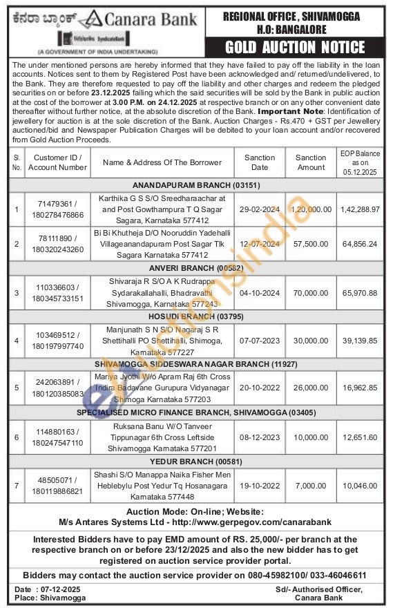 Canara Bank Gold Auctions Auction in Bengaluru